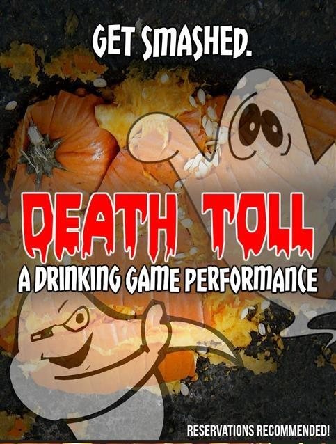 They say dying is easy and comedy is hard. At Corn, we say both are easy…especially when booze is involved! Back again like the Bird Flu, the original drinking show returns to the Cornservatory stage for the sixth installment of everyone’s favorite hor-omedy sketch show Death Toll – A Drinking Game Performance. A simple show with a twist…a lemon twist… Death Toll – A Drinking Game Performance offers up hilarious and spooky sketches where people die and the audience drinks every time they do (with the help of our incandescent DRINK sign)!