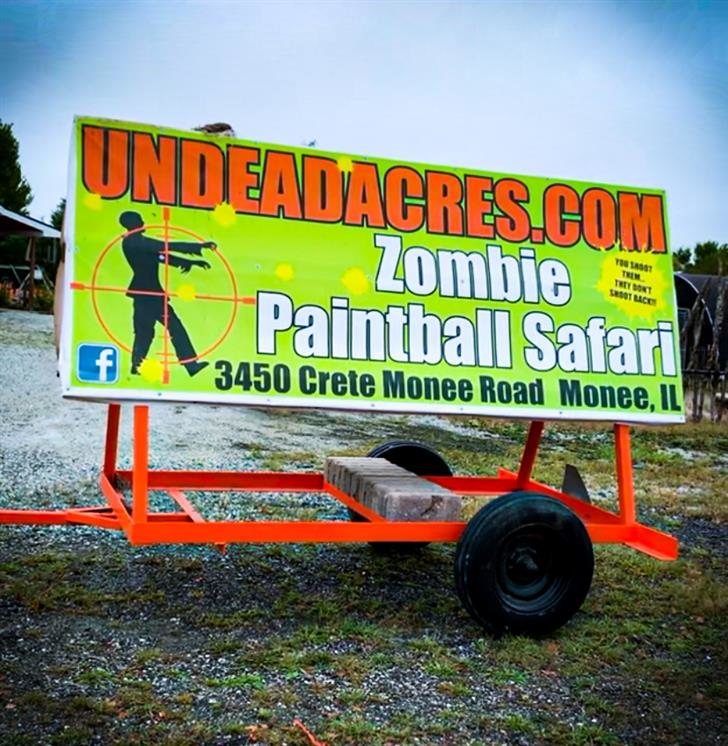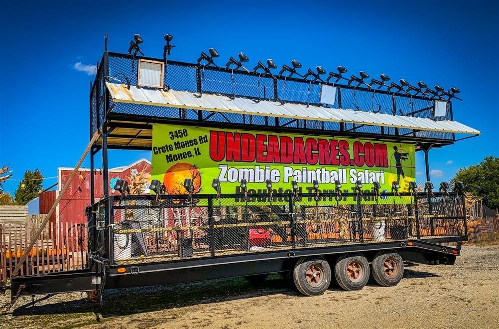 Ride through our Zombie Infested Nursery in our specially designed paintball trailers with mounted paintball guns. Shoot live zombies!! But don't worry, they don't shoot back.