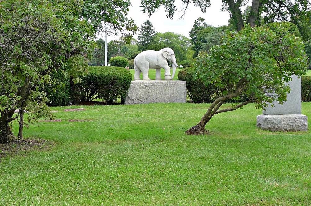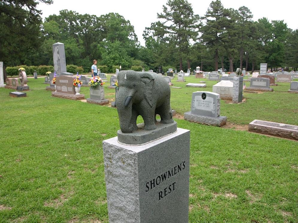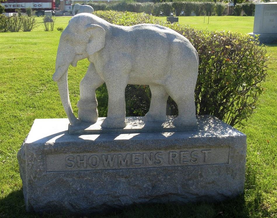 Showmen's Rest is a section of Woodlawn Cemetery that contains the remains from a 1918 circus-train wreck in a mass grave. Between 60 and 110 employees were killed when another train conductor fell asleep, causing the train to hit the circus-train. Since many of the victims' names were not known, a lot of the markers say things like "unidentified male," or "Baldy," or "4 Horse Driver." The section is still used today for burials of circus showmen and locals have reported hearing the sounds of phantom elephants at night.